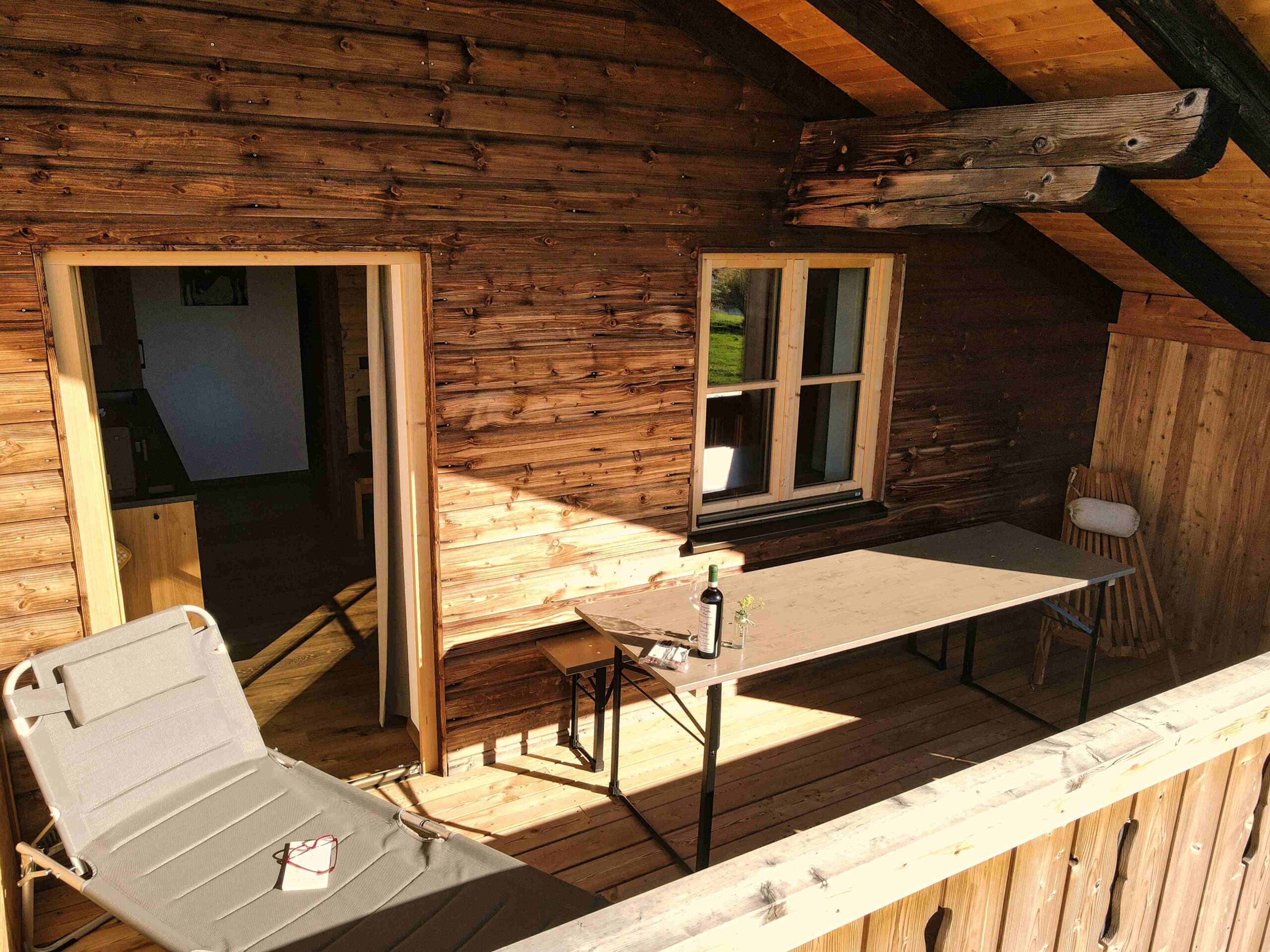 11 m² Balkon, überdacht & mit Holzboden, viel Sonne & grandiosem Panoramablick. Tisch, Bank, Houe Sonnenliege und Sonnenschirm. Perfekt für Sonnenaufgänge, Schlossblicke, Sonnenuntergänge, Alpenglühen und Sternenhimmel – und einfach zum Entspannen.