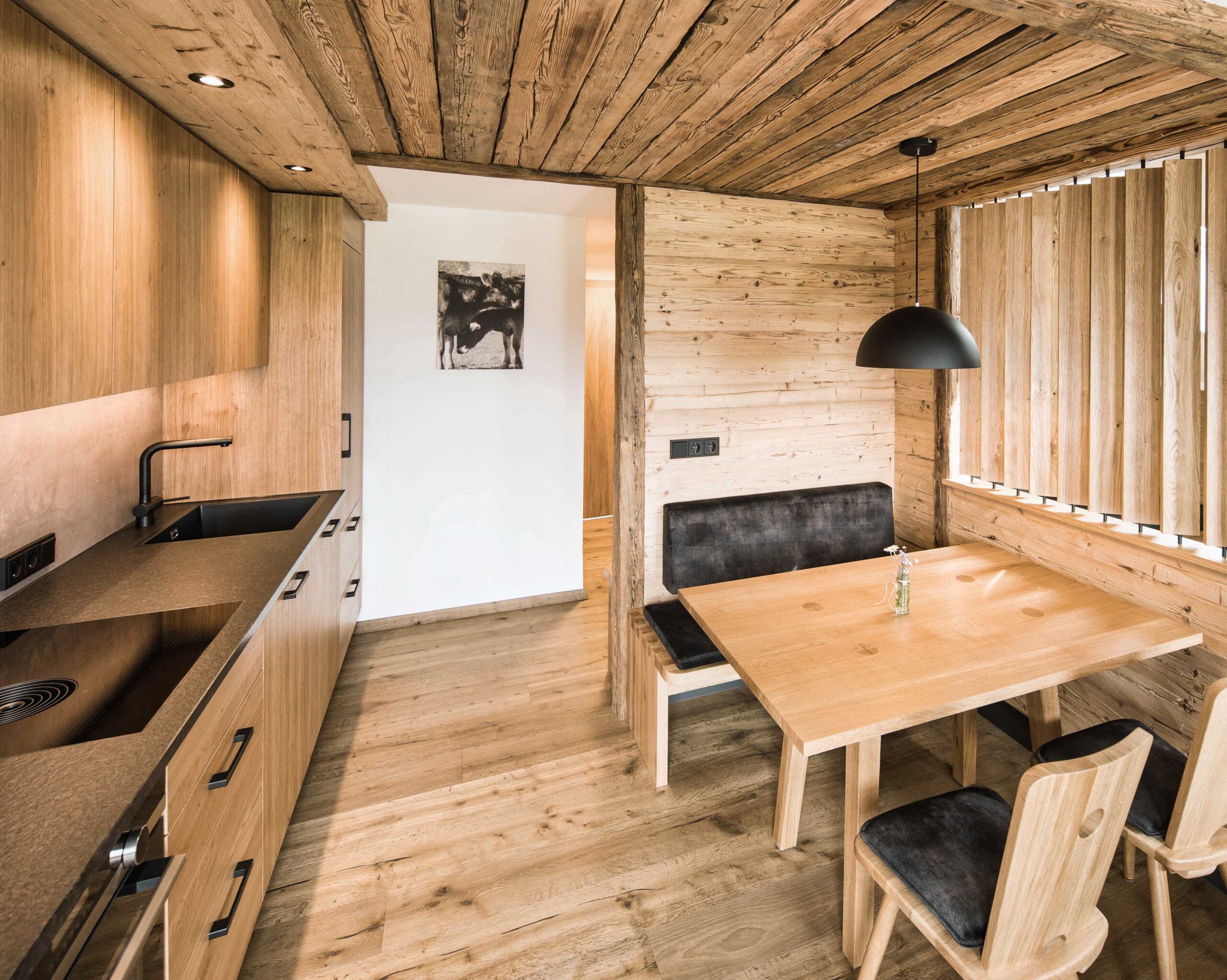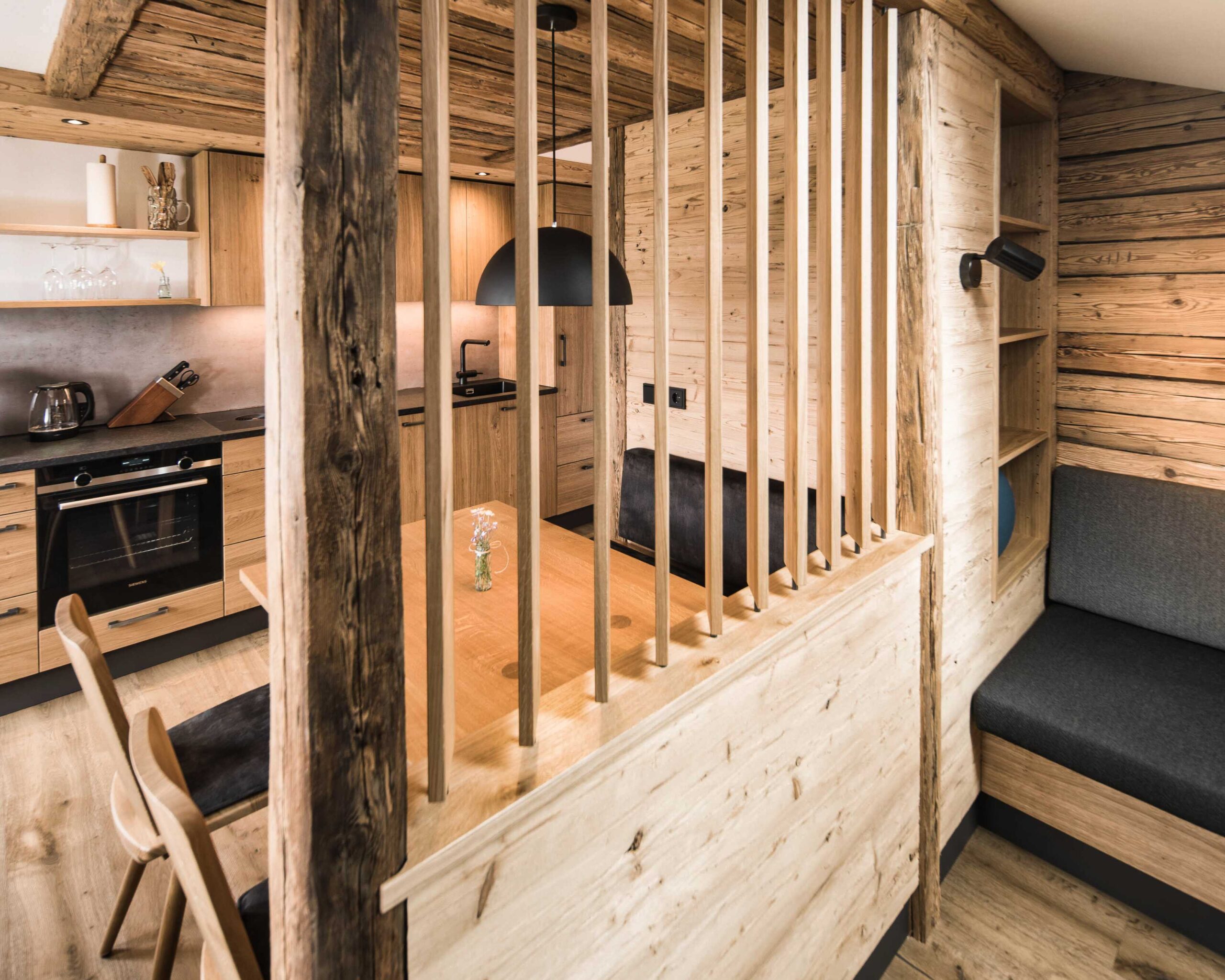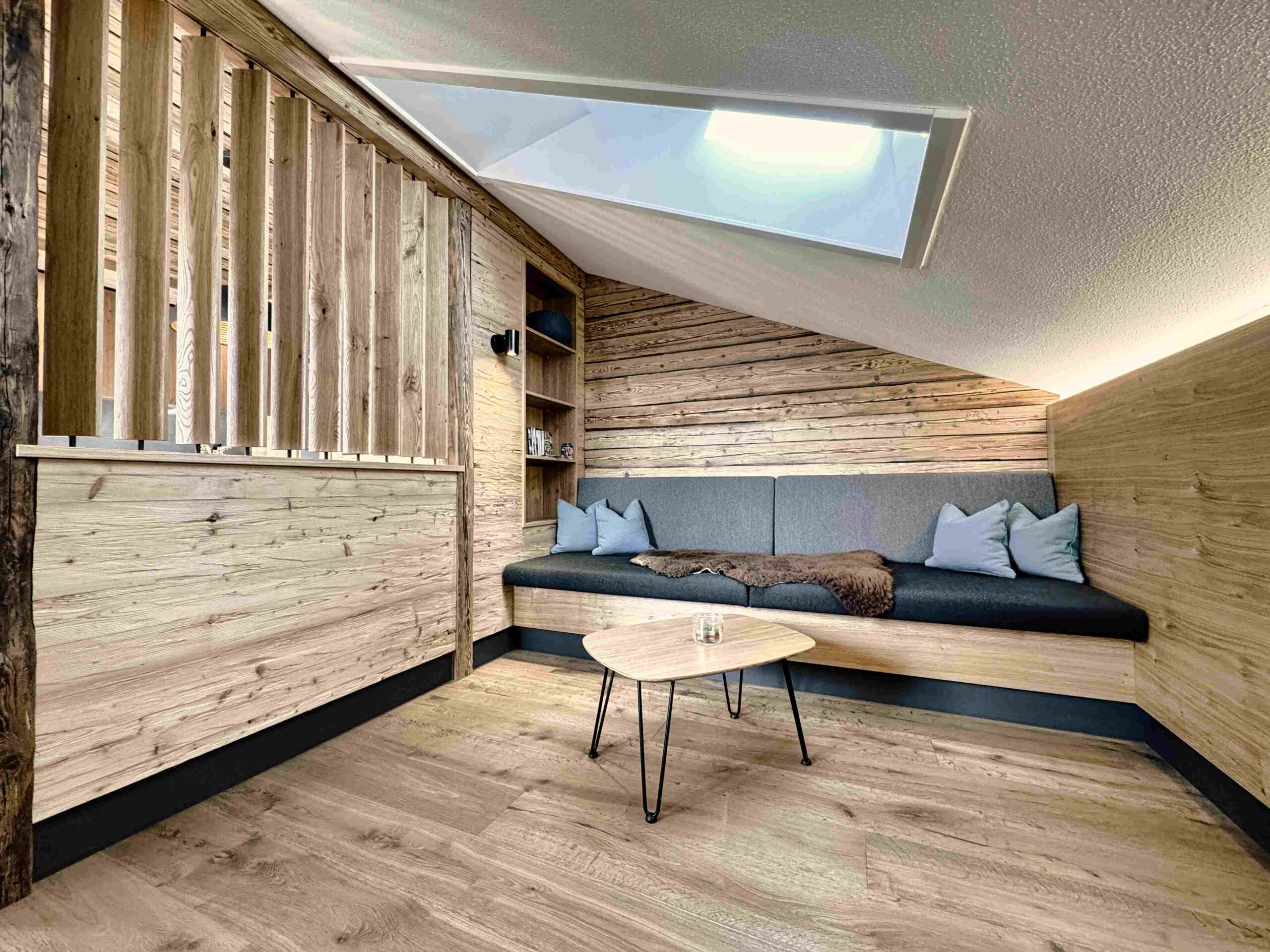 Die offene Wohnküche mit gemütlicher Essecke, gut ausgestatteter Küche und kuscheligem Sofa mit Schaffell lädt zum Entspannen ein. Ein kleiner Schreibtisch mit Ausblick ist ebenfalls vorhanden – zum Schreiben, Lesen oder für Deine Workation mit Bergkulisse. Für Deine persönliche Auszeit findest Du außerdem eine gute Yogamatte und ein Bio-Meditationskissen im Chalet.