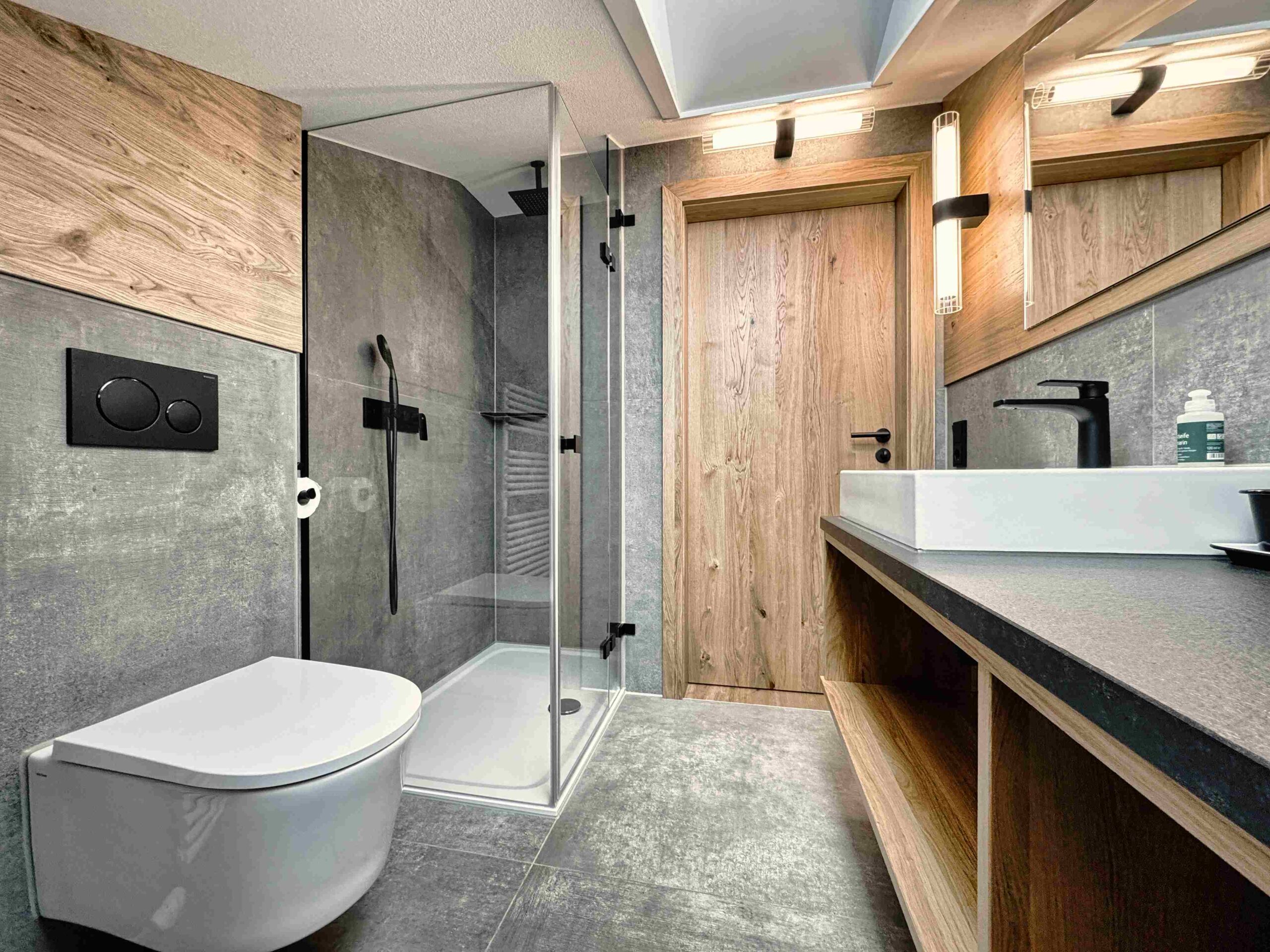 Hochwertige Materialien, erfrischender Duschkomfort mit Regendusche, Fußbodenheizung, Naturstein und Gessi-Designarmaturen sorgen für ein feines Raumgefühl. Dazu Bio-Handseife, kuschelige Bio-Handtücher, Handtuchwärmer, Föhn und Kosmetikspiegel – für Deine ganz persönlichen Wohlfühlmomente.